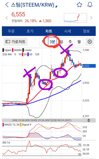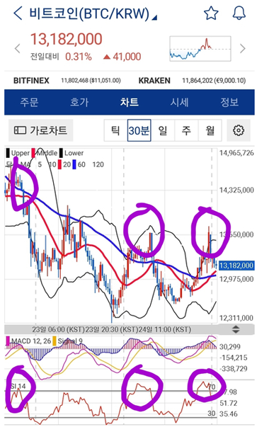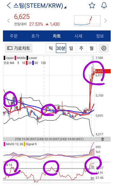 위 차트 고점 부분 동그라미 3개 모두 아래 RSI 지표 70이상에서 출현하였습니다.