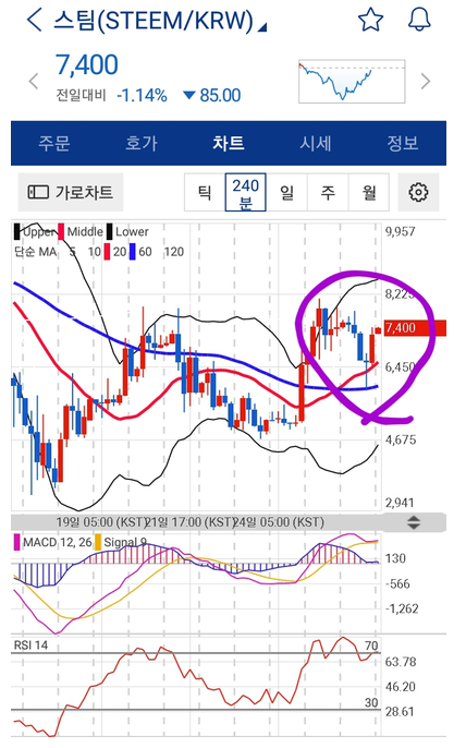 빨간색 20이평선이 파란색 60이평선으로 뚫고 올라가는 그림으로 주가도 같이 보시면 가격 상승이 가파르게 이루어지고 있습니다.