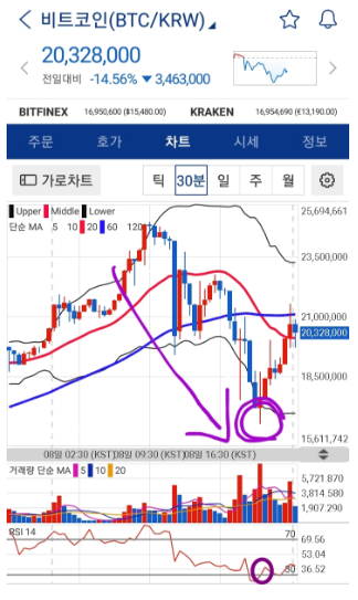여기서 데스크로스가 나가 하락추세가 가속화 될 가능성이 높기 때문에 손절 혹은 익절을 하고,저점을 다시 잡거나 비트맥스를 통해 공매도를 치는 방법이 있습니다.