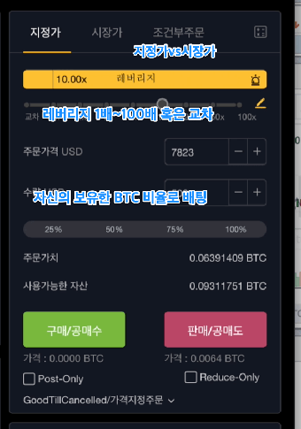 레버리지 1배~100배까지 지정하거나 교차 마진 가능하며 시장가vs지정가 선택해서 공매수,공매도 포지션 잡으시면 됩니다.