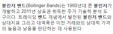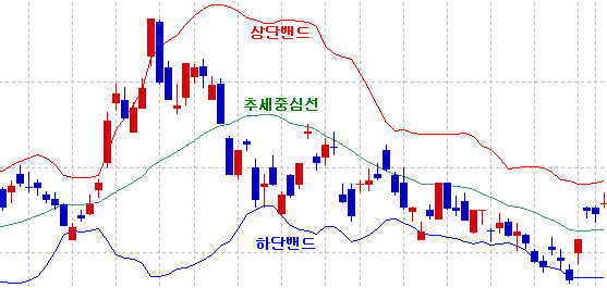 다양한 차트 보조지표 중 기본에 해당되는 볼린저 밴드입니다.볼밴이라 줄어서 부르며,주가의 과거 추세를 밴드(band)로 도식화하여 보여주므로써 앞으로 주가 흐름을 예측하는데 쓰입니다.