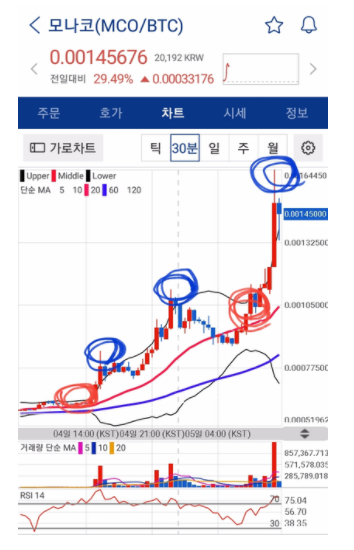 볼린저밴드로 매수 타이밍을 잡을때는 차트가 중심선인 20이평선을 뚫고 상승하는 타이밍이 좋습니다.위 차트 속 붉은색 동그라미가 바로 이 타이밍 입니다.