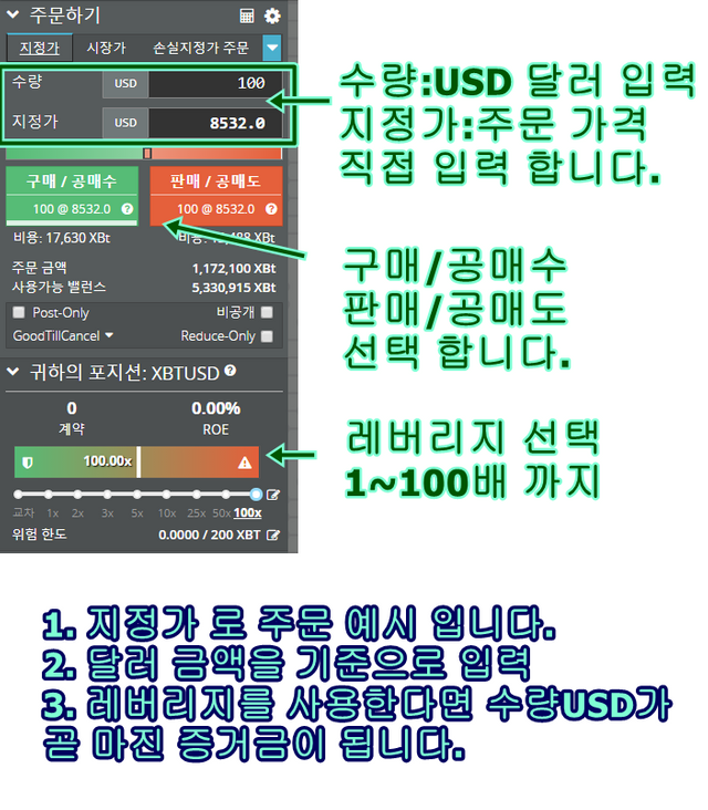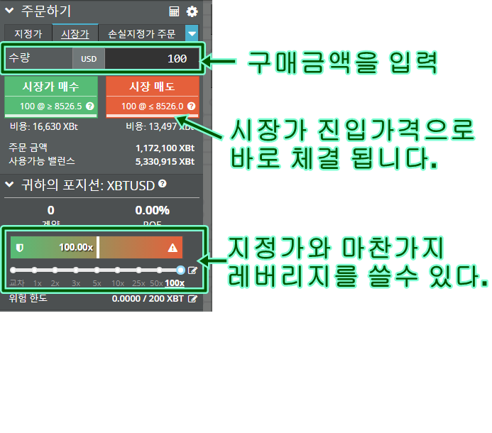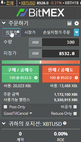 그림 과 같이 주문하게 되면 100달러치를 지정가 8532달러 가격에 구매/공매수 나 판매/공매도 를 선택하여 포지션 체결을 할 수 있는 것 입니다. 내가 지정한 가격과 시장시세가 맞아 떨어질때 까지 주문체결은 대기 되게 되겠죠?