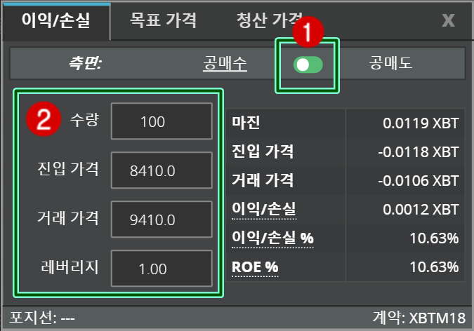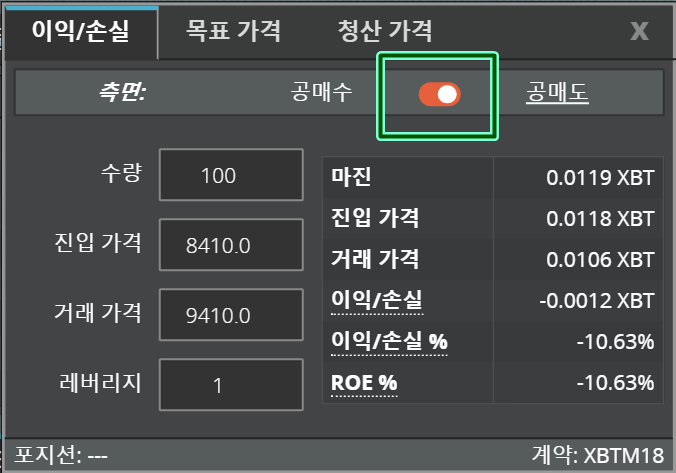 이익/손실 계산란 에서 포지션을 (1)공매수 로 놓고 (2) 계산값을 수량 100USD 에 진입가격은 8410.0USD 로 예상가격인 거래가격 에는 9410.0을 레버리지 는 1.00배로 레버리지 이용을 하지 않았습니다.