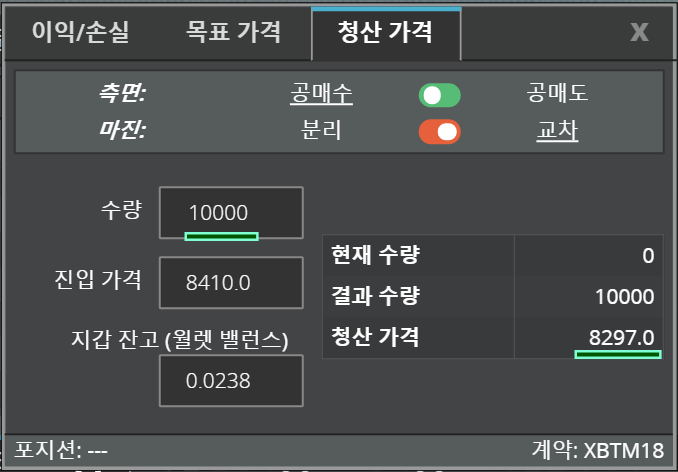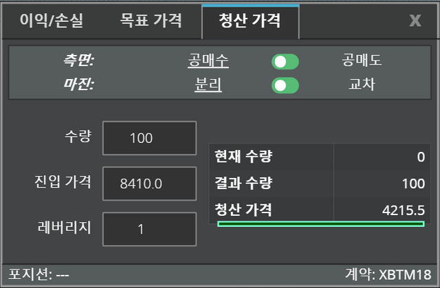 수량100USD 로 진입가격 8410.0USD 에 레버리지 1로 공매수 를 하였다면 청산가격은 4215.5USD 가 됩니다.