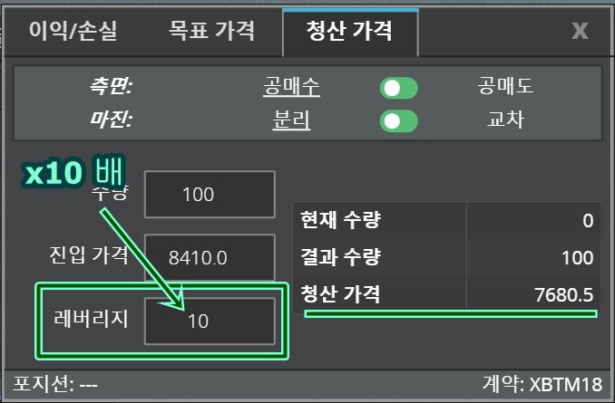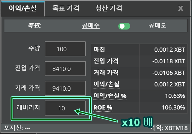 이번에는 다 똑같고 레버리지만 1배에서 --> 10배로 변경하여 입력하였습니다.