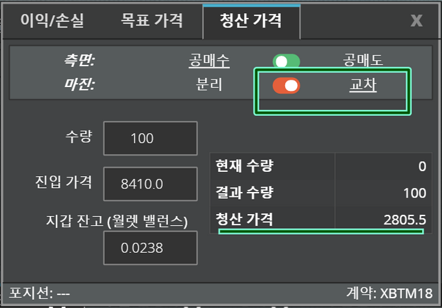 청산가격이 2805.5 로 변경이 됩니다. 왜냐하면 내 수량 마진 100 만큼에서 내 지갑의 잔고 까지 모두 증거금 으로 추가로 더 걸었기 때문에 청산가격이 하락 하게 됩니다.