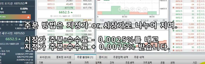 시장가는 바로 체결이 되나 -0.0025% 수수료를 내고 지정가는 지정가에 도달했을시 체결이 되기 때문에 100% 체결을 보장할수없습니다.하지만 수수료를 오히려 돌려받습니다. +0.0075% 돌려받습니다.