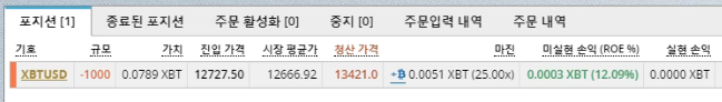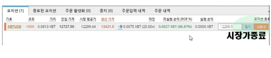 모든 주문과 수익률 해외거래소 평균시장가로 이루어집니다.현재 시장 평균가(12929.82) 이며,청산가격(13421)으로 가격이 청산가격에 도달하면 파산하기 때문에 주의하세요.