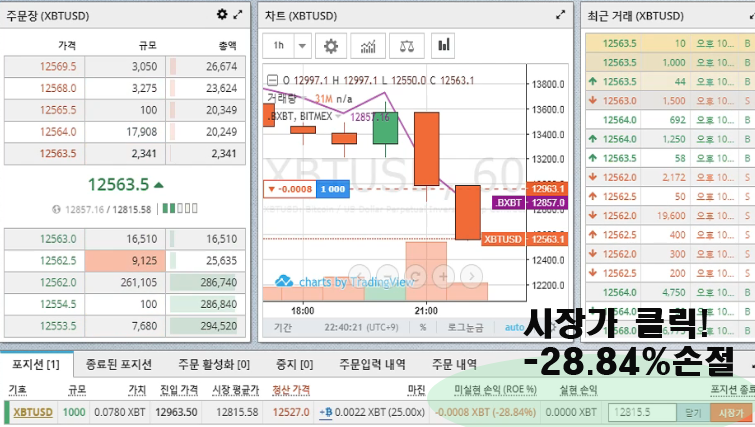 이전 공매수한 포지션을 보니.-28.84%가 떳네요.마진배율 10배에 맞쳐도 5분만에 이른 % 보시게 됩니다.장세가 너무 떡락중이기에 손절을 해보죠.