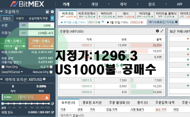 지정가(1296.3)에 US1000불 공매수를 쳤습니다.비트맥스 인터페이스 상 공매수는 녹색/공매도는 붉은색