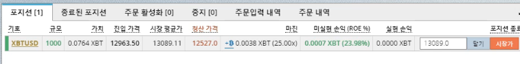 다음,지정한 가격에 도달하면 바로 거래가 체결되면서 '주문활성화 -> 포지션'으로 창이 넘어갑니다.여기까지가 공매수입니다.
