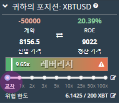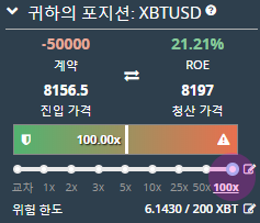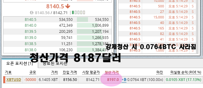 위 예시를 보면 진입가격은 8156달러 0.0765BTC 100배공매도로 진입하였습니다. 청산가격은 8187달러로 약간만 비트코인 가격이 상승해도 강제청산 당해 0.0765BTC를 잃을 수 있습니다.