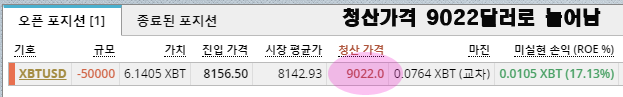 교차모드로 변경하는 순간 청산가격은 8187달러 -> 9022달러로 넉넉해 졌습니다.그 댓가로 제가 비트맥스에 보유하고 있는 잔금 전액을 담보로 잡혔습니다.제가 가진 비트맥스 잔액이 많았다면 뚝배기는 더 넉넉해 지겠죠?