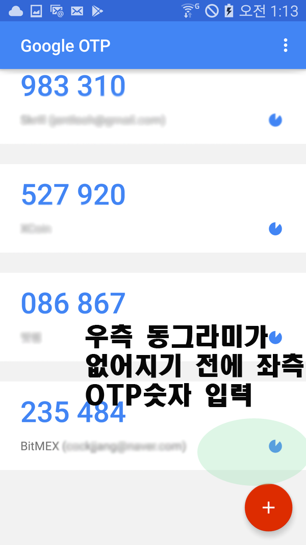 혹시나 해서 구글 OTP 사용법 말씀드리면 우측에 동그라미는 10초 간격으로 생성됩니다.생성된 후 시간이 갈수록 모래시계 처럼 줄어들고.다 없어지면 좌측 숫자도 바뀝니다.
