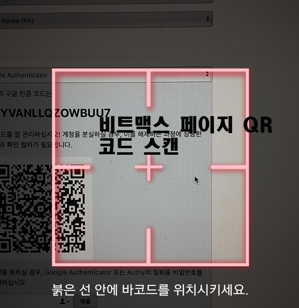 요렇게.핸드폰을 컴퓨터 QR 코드에 들이대로 바로 인식하면서,비트맥스와 핸드폰 구글 OTP가 연동됩니다.