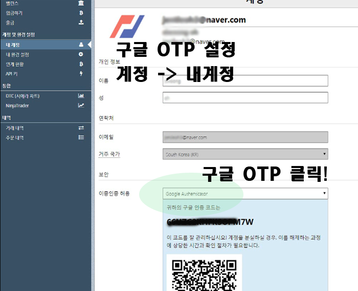 비트맥스 메인 상단 '계정->내계정' 이동하면 위와 같이 뜹니다.그러면 아래 이증인증 허용에 'google acuthnticator'보이시죠? 그 아래로 QR코드도 보입니다.