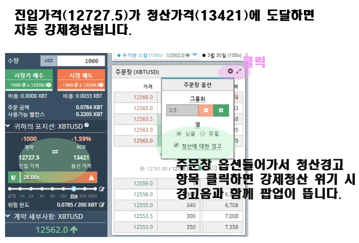 그럼.강제청산 방어에 앞서.편의를 위해 좋은 옵션입니다.이는 떡락.떡상이 떠서 청산위기로 몰려갈대 경고음과 함께 팝업을 뛰어줍니다.대게 - 40% 손실쯤 울리기 시작하고.손실이 늘어날 수록 팝업이 미친듣이 뜹니다.
