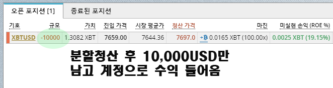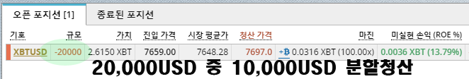 예를 들어 20,000달러 어치 비트코인 공매도를 한 후 이중 절반인 10,000달러를 분할청산을 해보죠.
