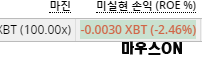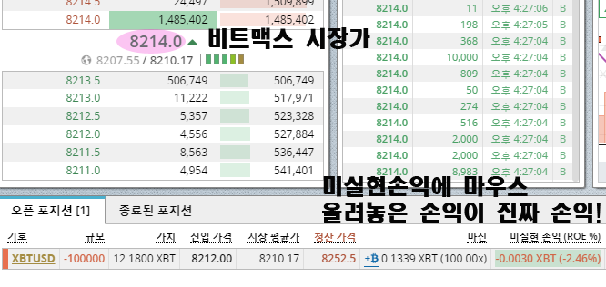 마우스를 올리기전에는 + 수익 올라면 - 마이너스가 난 이유는 처음 진입을 할때는 시장평균가로 진입을 하고 나올때는 비트맥스 평균가로 팔고 나오기 때문으로.실제 우리가 눈여겨 볼 부분은 바로 마우스로 올렸을때 미실현손익입니다.