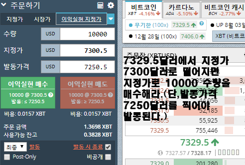 7329.5달러에서 지정가 7300달러롤 떨어지면 지정가로 10000 수량을 매수하라는 주문입니다.단 발동가격인 7250달러를 찍어야 7300달러에서 지정가로 매수합니다.
