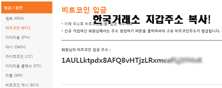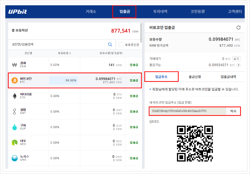 업비트 ▶ 입출금 ▶ 입금주소 복사
