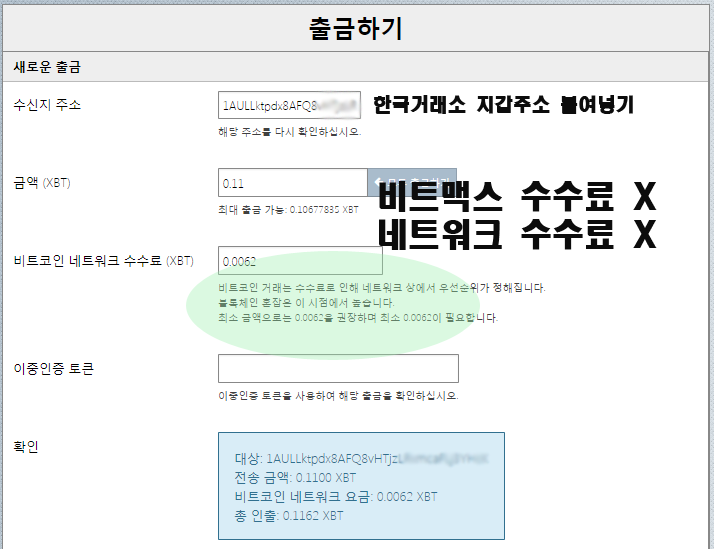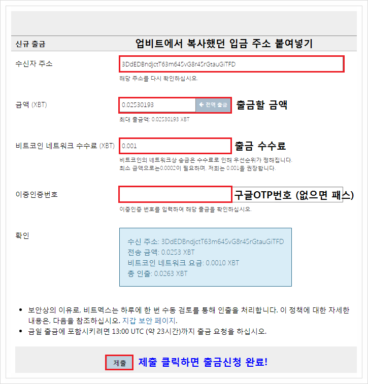 다음 출금하기를 누르시면 출금창이 뜹니다. 거래소 지갑주소 그리고 비트코인 수량 다음 수수료설정, OTP인증까지 차례대로 설정하시고 확인누르시면 출금신청이 완료됩니다.