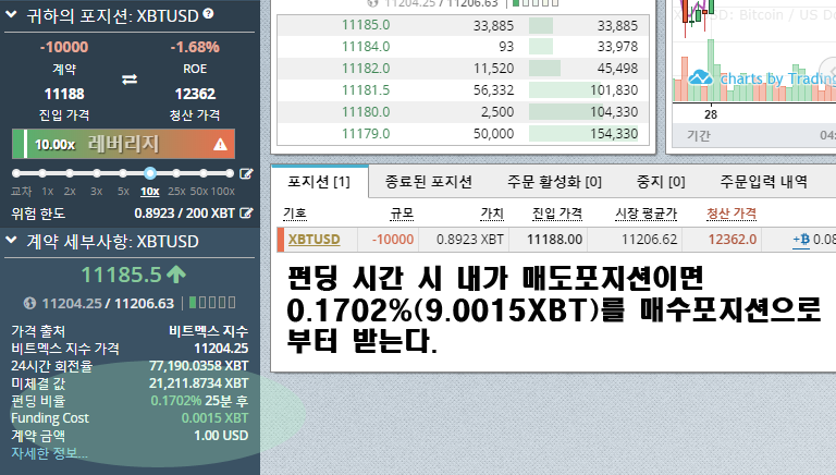 지금 포지션 항목을 보니 공매수 포지션에 배팅을 해놓은 상태입니다.그럼 좌측 하단 펀딩비율/funding cost 보이시나요? 29분 후 펀딩시간이 오는데.지금 처럼 공매수 포지션으로 있으면 대략 포지션 가치 0.8923XBT의 0.1702%인 0.0015XBT이 차감되며.이 금액은 반대인 공매도 포지션에게 지급됩니다.