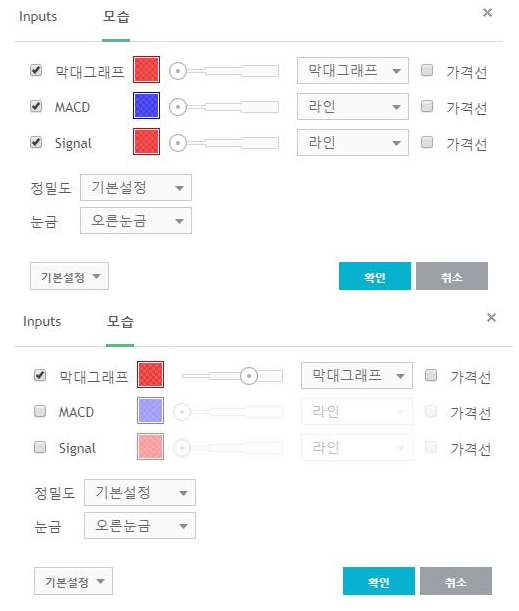 MACD 설정에 가셔서 MACD,SIGNAL을 지워버립니다.