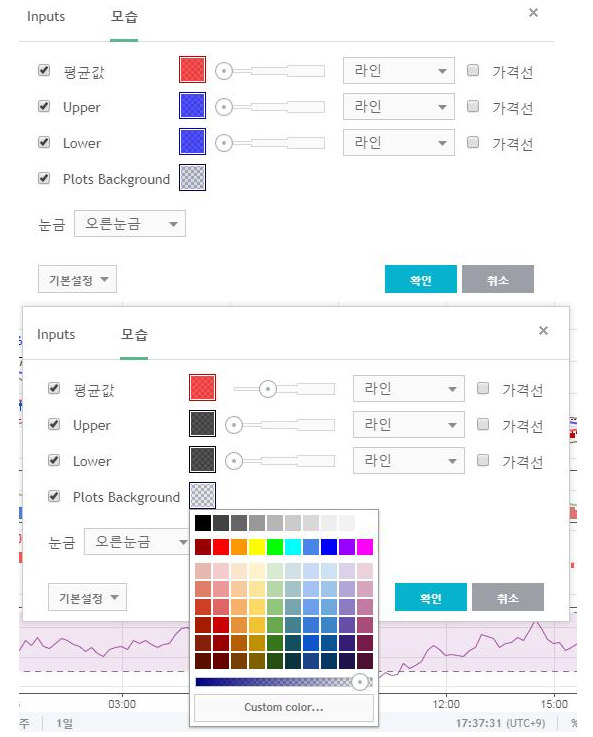 다음 볼린저밴드 설정에서 upper,lower을 검정색으로 하고 평균값선은 한단계 더 굵게 하세요.볼린저밴드의 평균값선은 20이동평균선입니다.