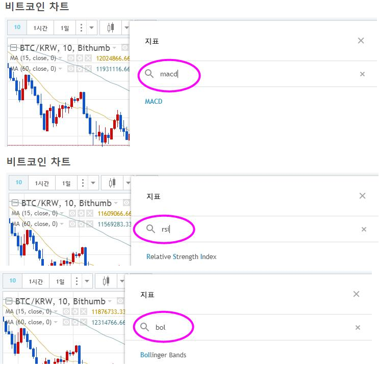 그럼 위와 같이 MACD,RIS,볼린저밴드가 활성화 됩니다.