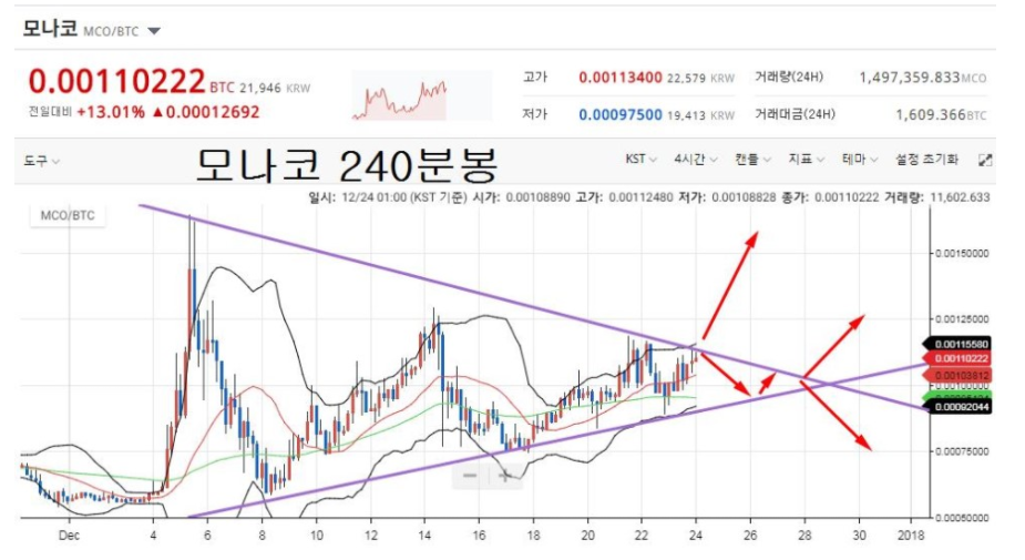 위 차트를 보시면 삼각형으로 수렴으로 하면서 움직입니다.아직 수렴은 안했으나,수렴할 무렵 혹은 수렴 지점에서 큰 변동이 일어날꺼라 예측 가능합니다.
