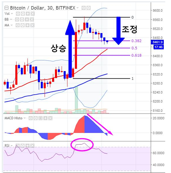 이때 조정비율은 앞으로 상승 세기를 예측하기도 합니다.상승 후 조정비율이 작게 올수록 더 높은 추가 상승을 예측합니다.경우에 따라서는 조정이 아닌 횡보를 하는 경우도 있습니다.되돌림이 거의 없는 경우죠.이 경우는 가장 큰 상승으르 예측할 수 있으며,지난 연말부터 비트코인 대세 상승기 역시 되돌림을 횡보로 대체하면서 상승했던 시절이 있었습니다.