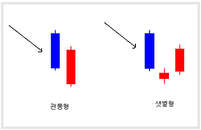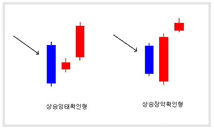- 샛별형과 비슷하나 가운데 십자형이 출현하면 좀 더 강한 상승추세 전환 의미