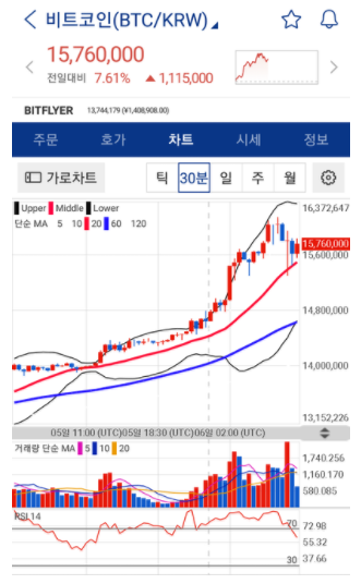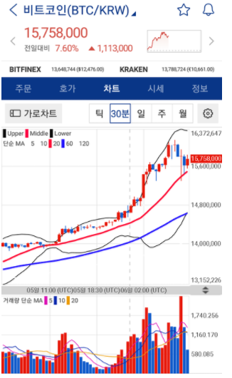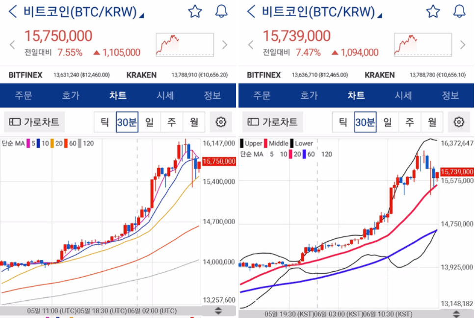 그럼 보조지표 3개를 다 설정하면 위와 같은 업비트 차트가 됩니다.
