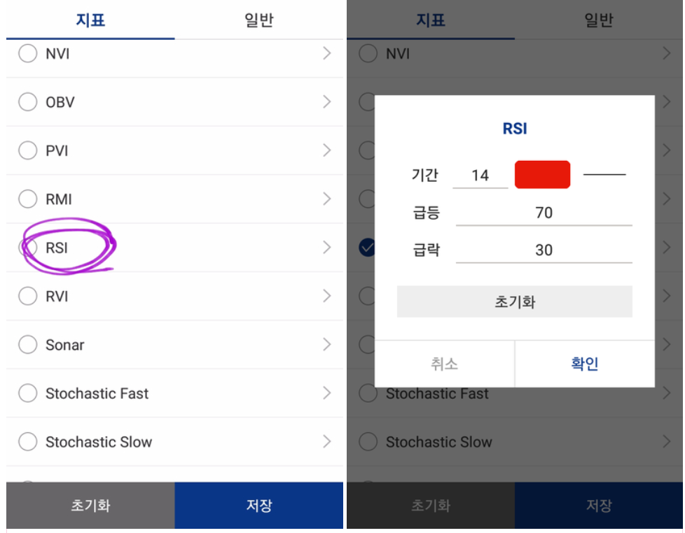 RSI 지표 70이상을 과매수구간,30이하를 과매도 구간으로 설정합니다.