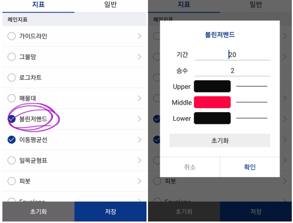 볼린저밴드 클릭하면 기간:20,승수:2 입력이 되어 있으며,그대로 사용하면됩니다.