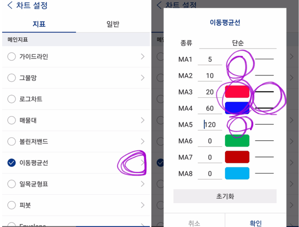 그럼 매매의 기본이 되는 이동평균선 설정부터 시작하죠.
