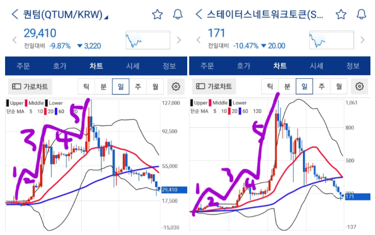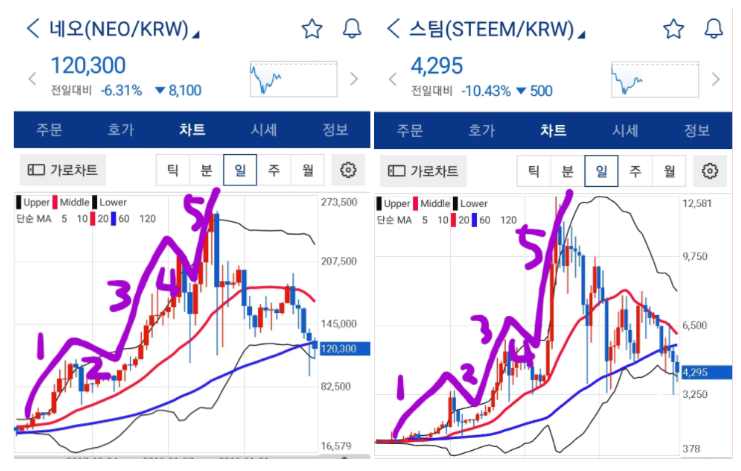 위 차트모두 엘리어트파동으로 설명이 가능합니다.