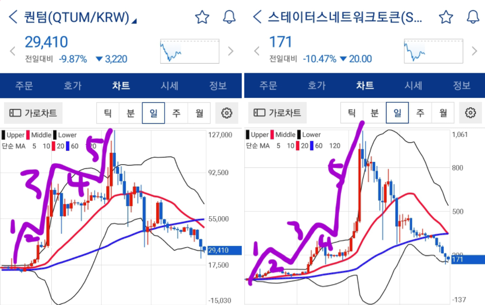 조정을 끝내고 다시 상승합니다.상승 폭은 3파 보다 적은 상승폭을 보입니다.이렇게 3번에 걸쳐서 상승을 했으니 이제 많이들 익절을 하면서 하락패턴으로 변합니다.