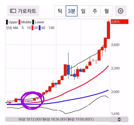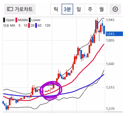 동그라미 구간을 보면 빨간색 20이평선이 60이평선을 뚫고 위에 있으면 그 위로 양봉이 뜨면서 상승하고 있는 차트입니다.이 타이밍이 매수 타이밍입니다.