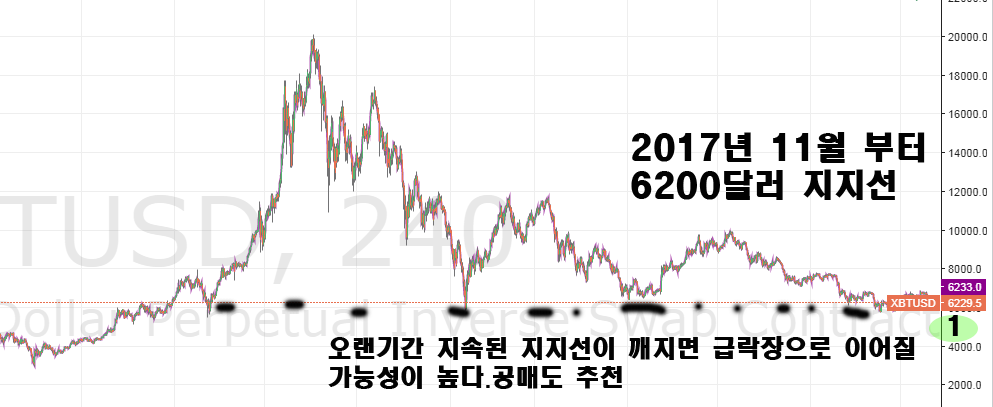 비트맥스로 돈벌기 가장 좋은 시점이 오랜기간 지속 된 지지선이 깨지고 패닉셀이 나오는 구간입니다.위 차트는 2018년 7월 14일 오늘 차트입니다.작년 2017월 11월부터 6200달러 지지선에 계속걸려있는 가운데.몇일째 6200달러 구간에서 횡보하고 있습니다.