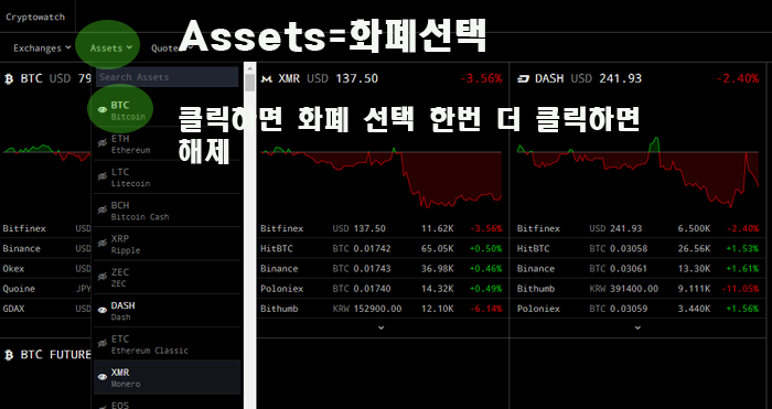 상단 'Assets'를 클릭하시면 다양한 화폐종류가 나오며,화폐 이름을 클릭하면 선택 한번 더 클릭하며 해제됩니다.자신이 필요한 화폐만 클릭해서 디스플레이 가능
