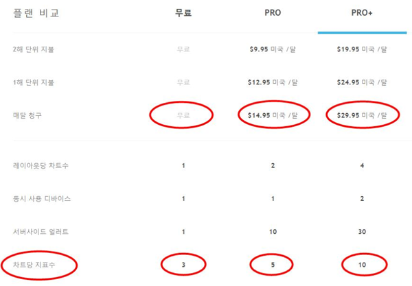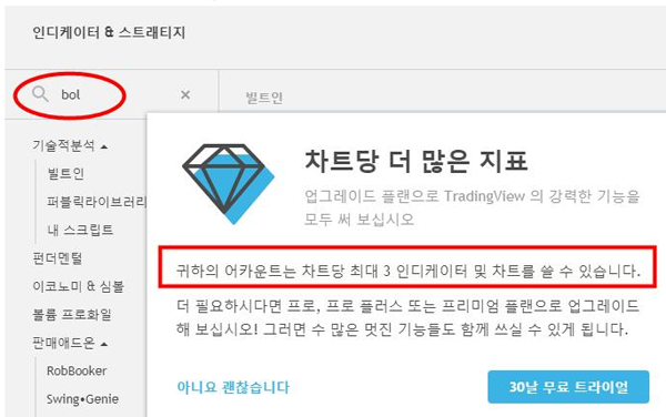 여기서 4개째 보조지표를 활성화 시키려면 위와 같이 유료버전 가입 안내가 나옵니다.다시 말씀드리지만 무료회원은 3개까지만 가능합니다.