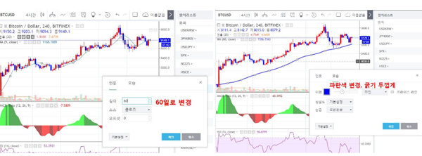 다음,이평선은 60일 이평선으로 파란색 글씨로 합니다.대게 이평선을 표시할때 60이평선과 20이평선을 동시에 쓰는데.이는 각각 보조지표 갯수에 포함되여,60일 이평선 하나만 추가했습니다.