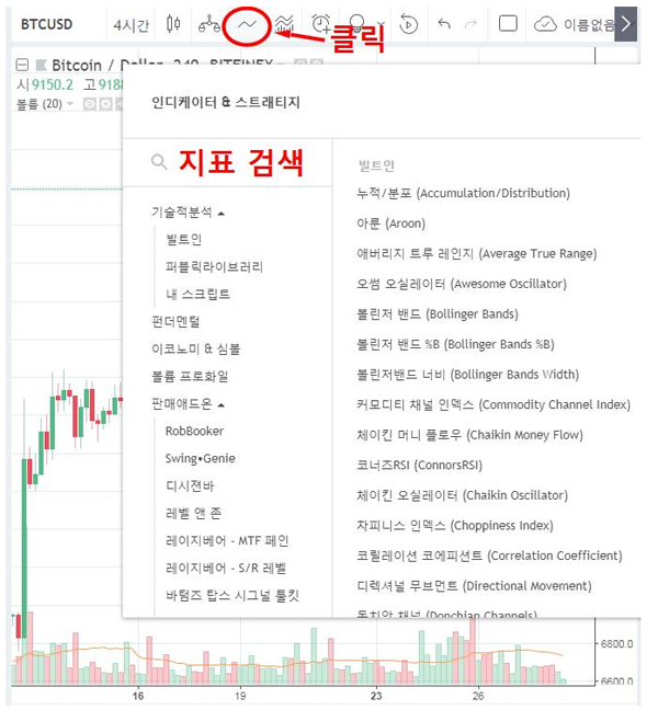 위 버튼 클릭! 하고 보조지표의 약자를 입력하면 해당 보죠지표 활성화가 가능합니다.빗썸,업비트 방식과 동일합니다.