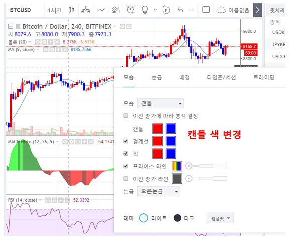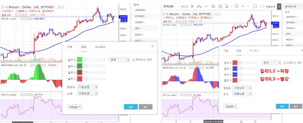그럼 보조지표를 추가했으면 이제 자신에 맞체 세팅해야 됩니다.기본적으로 보시쉽게 양봉은 빨간색,음봉은 파란색으로 셋팅합니다.