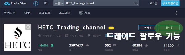 이렇게 트위터 처럼 팔로우도 가능하기 때문에 차트분석 잘하시는 분들 팔로우를 해놓으시면 나중에 매매 하실때 트레이딩뷰 들어와서 한번 분석글 보시면 많은 도움이 되실꺼라 생각이 듭니다.