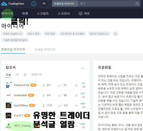 이동하시면 첫 화면에 유명한 트레이더 목록이 나옵니다. 열심히 활동하시는 'HETC_Trading' 분석사를 클릭하면.