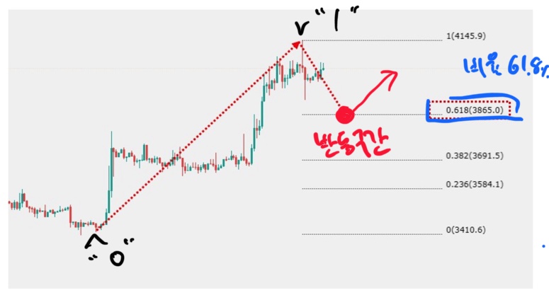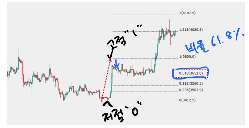 위 이미지 보시면 캔들의 가장 저점을 0으로 보고 가장 고점을 1로 보고 이를 피보나치 배율로 도식화 하면
